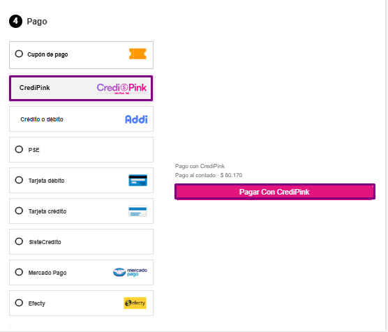 Debes elegir Credi Pink como método de pago y luego hacer clic en Pagar con Credit Pink.