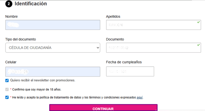 Una vez completes todos los campos y aceptes la política de tratamiento de datos, deberás hacer clic en Continuar nuevamente.