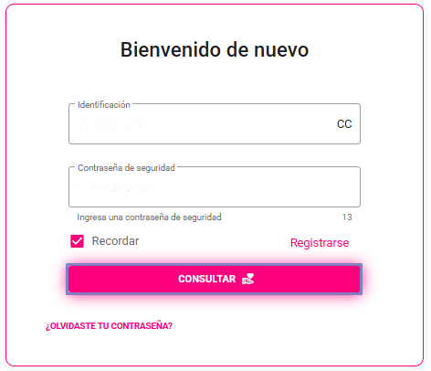 - Diligenciar el número de identificación y la contraseña asignada 🔑, luego hacer clic en Consultar.