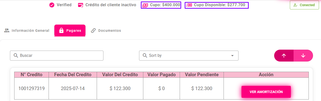 - Allí se podrá visualizar la información general del crédito, como el cupo y los créditos disponibles.