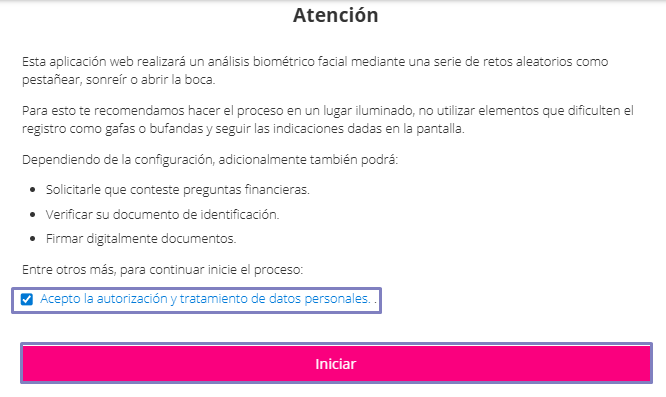 - En ese momento, se mostrará el mensaje de autorización para el tratamiento de datos, el cual deberás aceptar para continuar con el proceso..